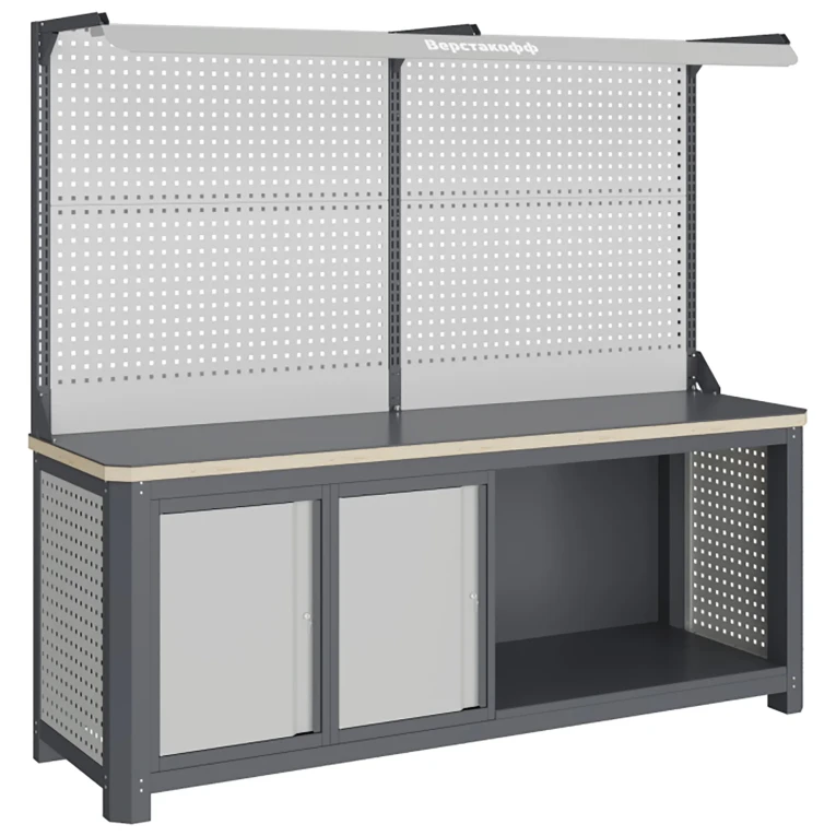 - экран (перфорированная панель) верстака выполнен с квадратной перфорацией 12х12 мм с шагом 38 мм для установки крючков, держателей и других аксессуаров;