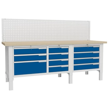 Комбинации модулей, опор и рамных элементов позволяют сконфигурировать верстак с единой столешницей длиной от 1200 до 3000 мм с шагом 200 мм. Система стыковки объединяет несколько верстаков любой длины в единое рабочее пространство, а угловые стыковочные блоки обеспечивают поворот рабочей поверхности внутри помещения. Опоры верстака позволяют выполнять регулировку его высоты в диапазоне от 700 мм до 950 мм с шагом 25 мм.Надежность рабочего места
