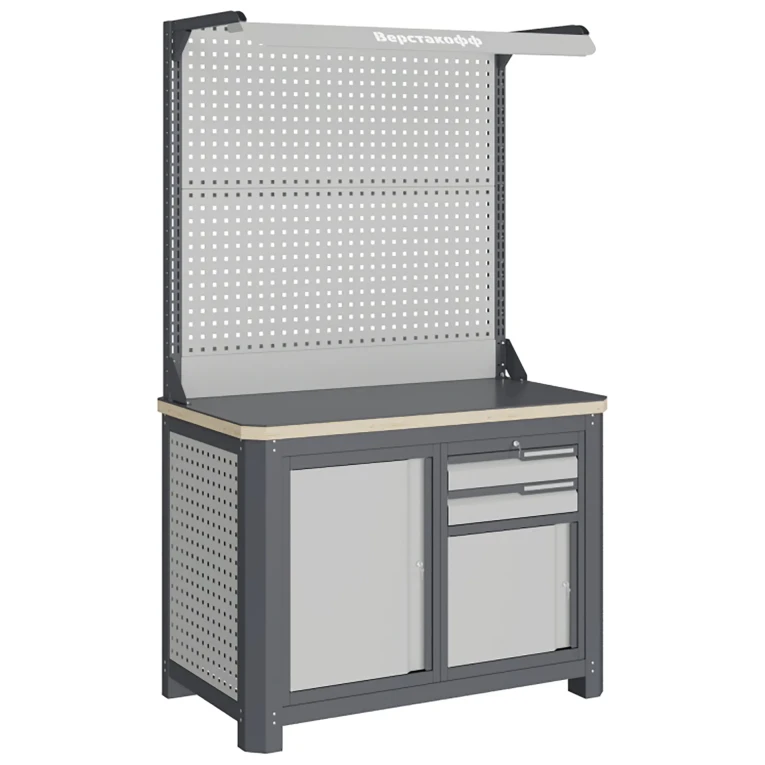 - экран (перфорированная панель) верстака выполнен с квадратной перфорацией 12х12 мм с шагом 38 мм для установки крючков, держателей и других аксессуаров;