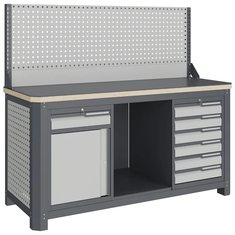 - экран (перфорированная панель) верстака выполнен с квадратной перфорацией 12х12 мм с шагом 38 мм для установки крючков, держателей и других аксессуаров;