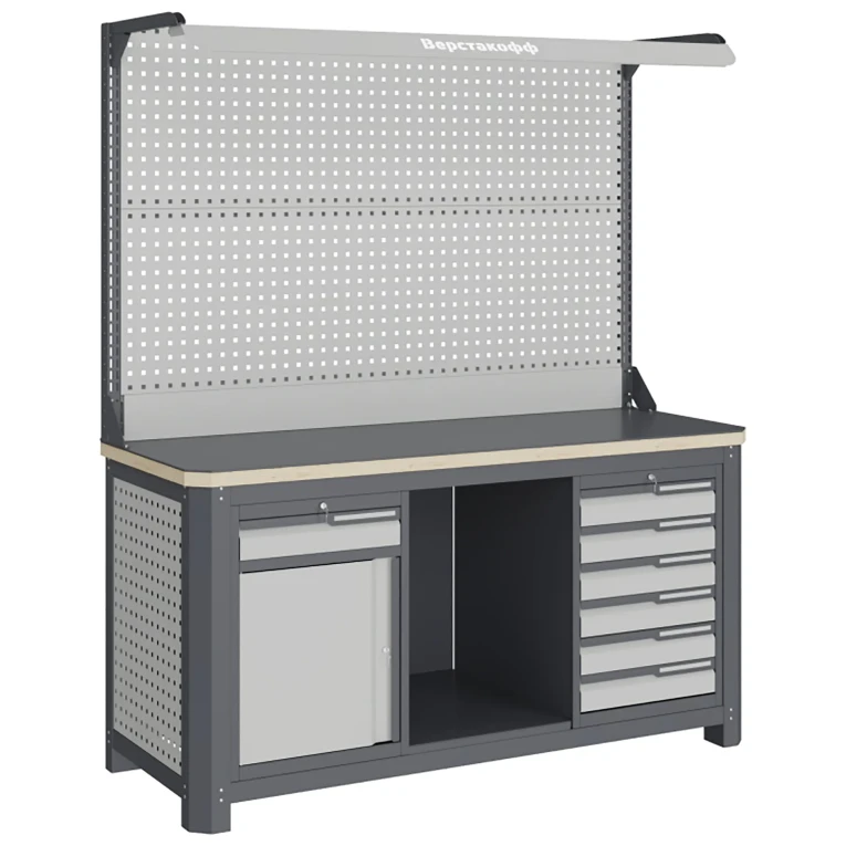 - экран (перфорированная панель) верстака выполнен с квадратной перфорацией 12х12 мм с шагом 38 мм для установки крючков, держателей и других аксессуаров;